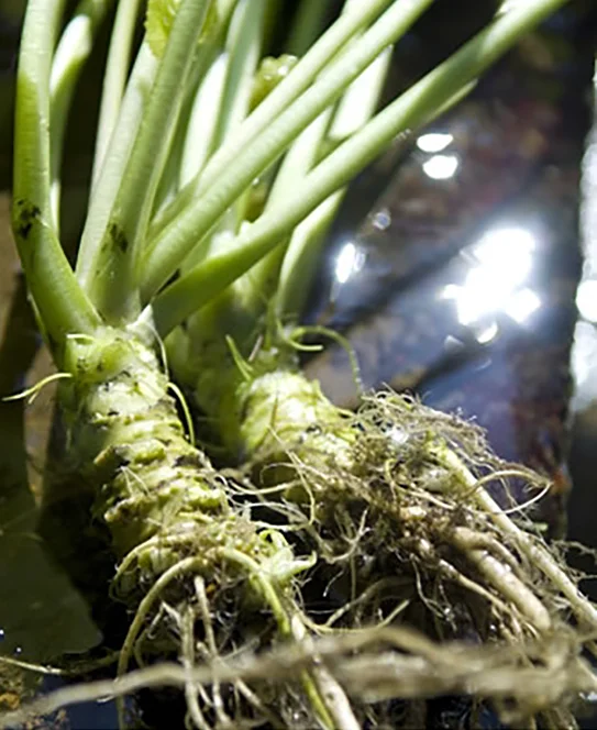 山の湧き水の養分だけで11~18ヶ月かけてじっくり育つわさび。